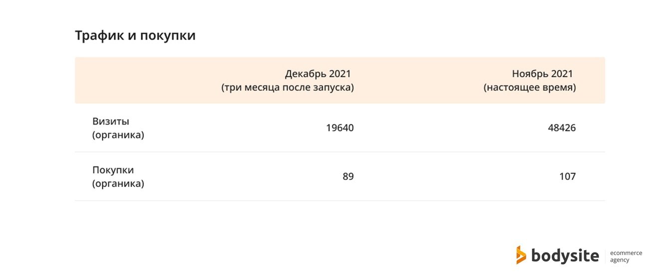 Первые ощутимые результаты стали получать в первый месяц после открытия нового сайта. Считаем как трафик, так и коммерческую эффективность — количество заказов и доход.