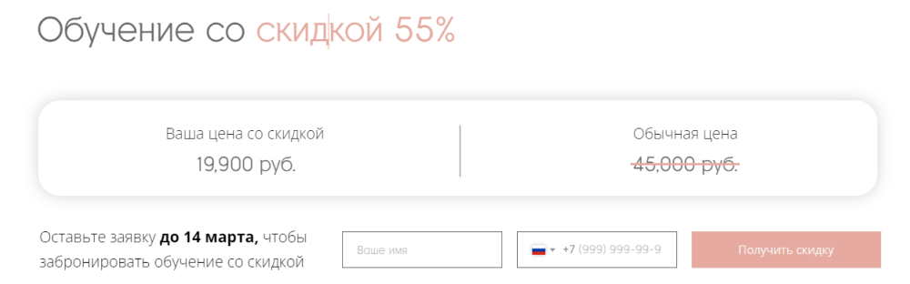 Наша гипотеза подтвердилась и показала отличный результат: после введения на сайта дополнительного окошка «Обучение со скидкой 55% до ** числа» конверсия увеличилась практически в два раза. При этом система автоматизирована и самостоятельно двигать дедлайн акции не нужно: при наступлении новых суток дедлайн двигается на +1 день.
