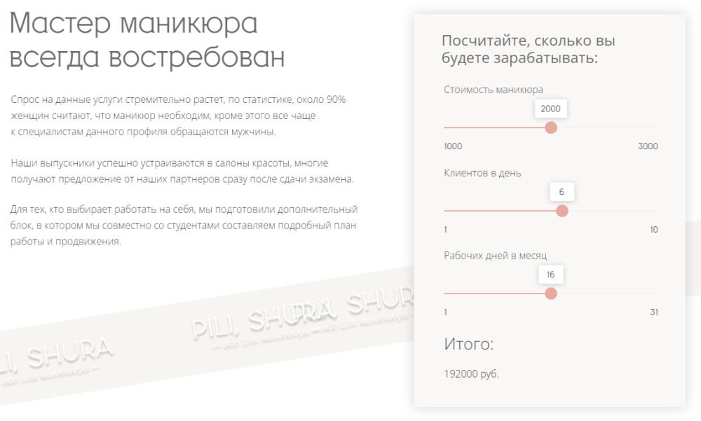 В настоящее время «PILI, SHURA» является ведущим центром обучения ногтевому сервису в Новосибирске. Благодаря качественному дизайну, удобной навигации и качественному продвижению сайт стал незаменимым инструментом для привлечения новых студентов.