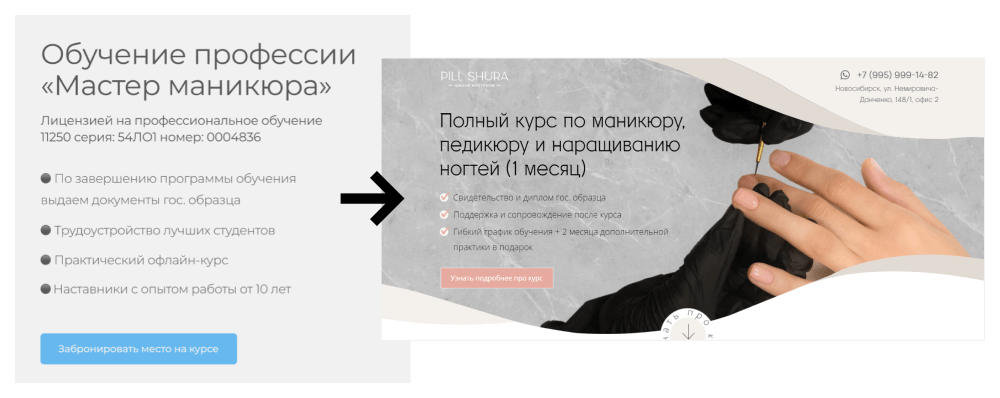 В дальнейшем мы изменили заголовок первой страницы с «Обучение профессии мастер маникюра» на «Полный курс по маникюру, педикюру и наращиванию ногтей (1 месяц)», потому что хотели отразить более полное и точное представление о курсе. Новый заголовок лучше отражает содержание курса и указывает на то, что студенты получат знания и навыки в разных областях всего за месяц обучения. Такой заголовок привлекает больше потенциальных студентов, которые ищут комплексное обучение по нескольким направлениям ногтевого сервиса.