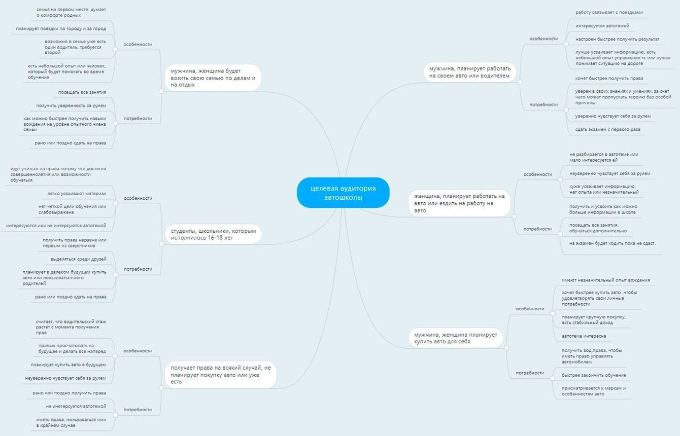 - демографические группы. Основная аудитория клиента — мужчины и женщины от 18 до 44 лет. Нами была разработана ментальная карта, на которой отобразили детальные интересы.