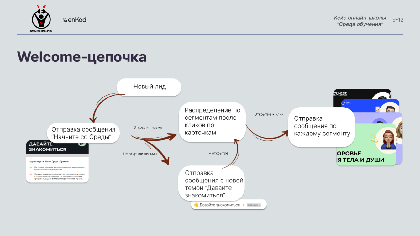 Письма по сегментам созданы на основе экспертизы школы и выращивают лояльных клиентов. Если на этапе welcome-цепочки студент ничего не купил, далее у нас будет шанс довести его до покупки, посылая экспертный контент.