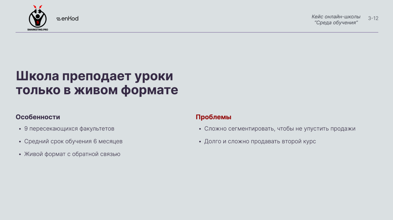 В школе 9 факультетов, но 3 из них имеют чёткую направленность и различаются по целям: это факультеты маркетинга, кино и психологии. Мы решили сегментировать базу на 3 этих больших части, а тем, кто еще не определился, помогать с выбором новой профессии.