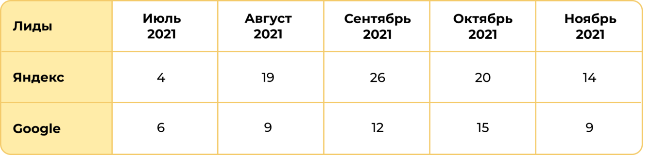 – снижения стоимости лида на 55% – благодаря перераспределению бюджета и работе с семантикой;