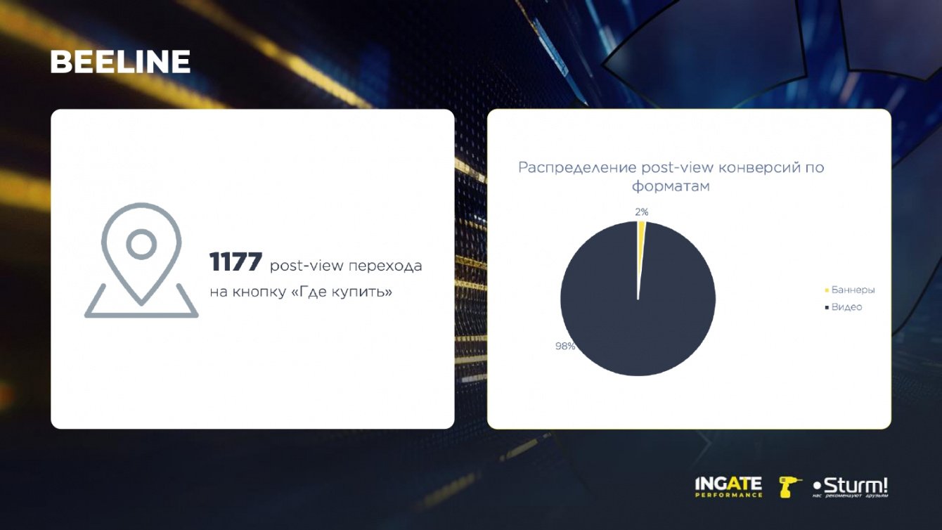 Beeline принес на 42% больше post-view-конверсий, чем Яндексе. Процент post-view-конверсий составил 0,015%. Гипотеза о качестве площадок оказалась верной, и канал действительно стал самым эффективным в сплите, несмотря на то, что обычно он не дает много post-view-конверсий и работает только на качественный охват.