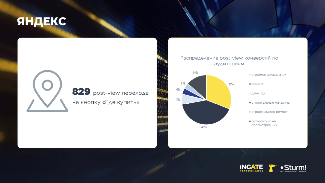 В Яндексе ожидали кликабельность на уровне 0,3%, и этот прогноз удалось перевыполнить. Показатель досматриваемости тоже превзошел ожидания — 75% против запланированных 70%. Это высокий показатель для рекламного видео, и он говорит о том, что аудитории понравился креатив, а реклама оказалась релевантна.