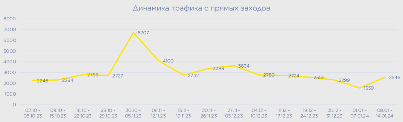 Для оценки эффективности рекламной кампании мы отслеживали динамику прямых переходов, которые наиболее чувствительны к охватным рекламным кампаниям, и использовали Search Lift для учета сезонности. После запуска медийной рекламы прямой трафик на сайт увеличился в 2,5 раза, и, несмотря на небольшое снижение после пикового значения, остается выше уровня до запуска рекламы, даже с учетом сезонного снижения в праздничные дни.