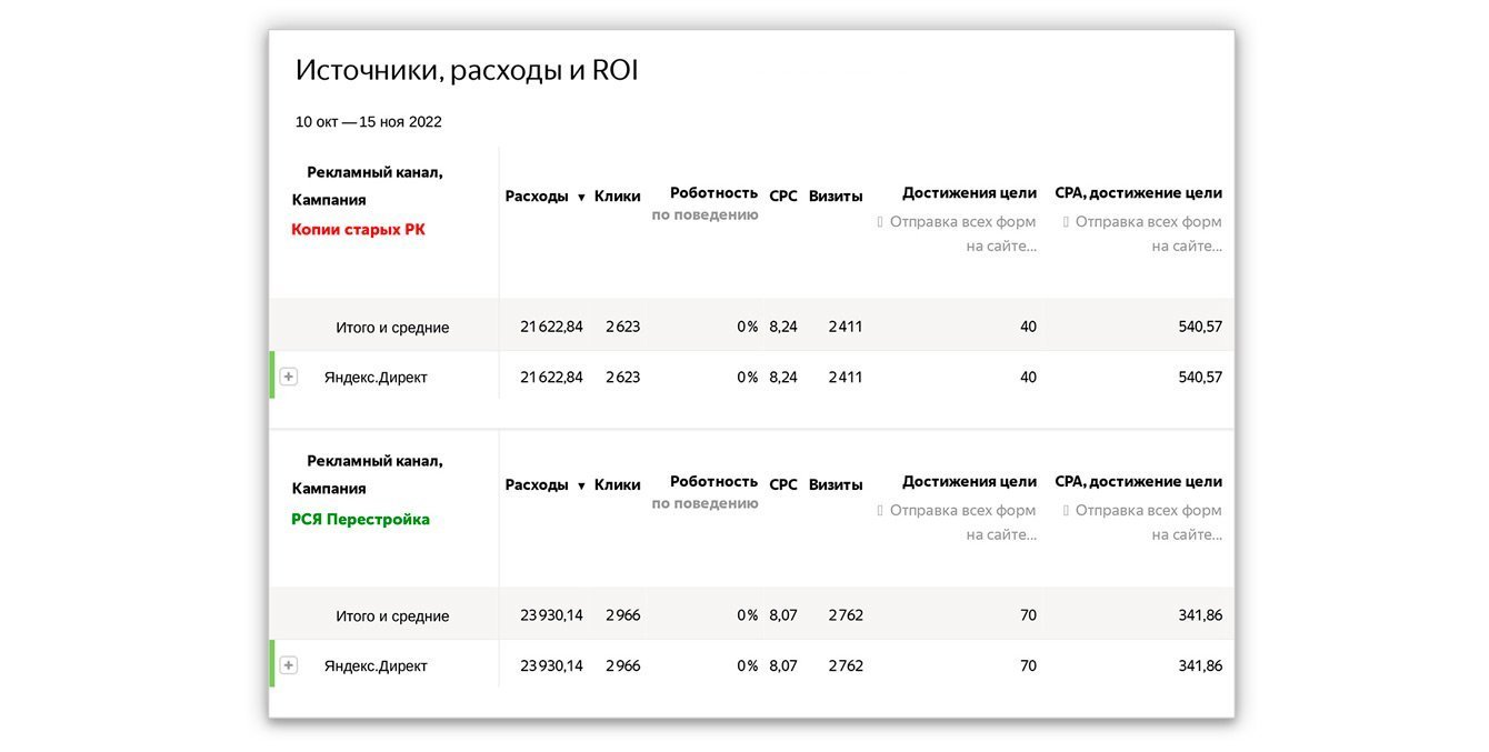 P.S. Поясним, зачем копии. Новую структуру мы создали в системе с нуля. А любая новая рекламная кампания будет какое-то время копить статистику и «обучаться». Старые РК давно прошли этот процесс и работают с багажом опыта, причём слишком старый «опыт» РК может быть уже не актуальным для оптимизации кампаний на сегодняшний день. Соответственно, копии вместо оригиналов старых РК нужны были для чистоты эксперимента.