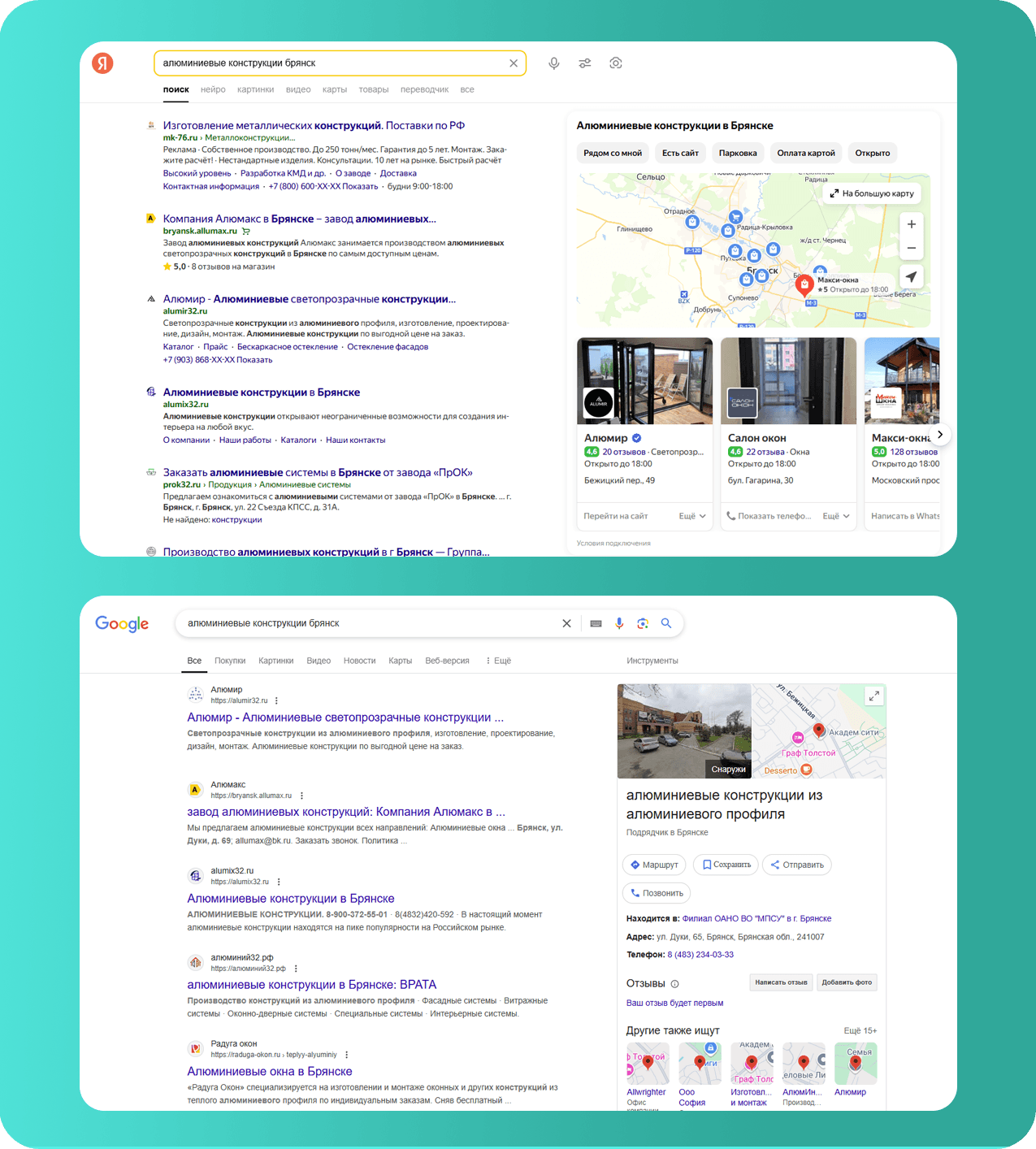 По запросу «алюминиевые конструкции брянск» сайт находится на первом месте в Google и топ-2 Яндекса.