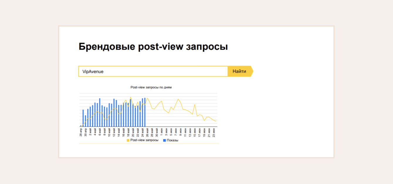 Мы видим, что конверсий в заказы стало больше, и наблюдаем прямые транзакции — когда человек увидел рекламу, перешел по ней и сразу приобрел товар. После окончания кампании мы снова запросили у Яндекса данные по брендовым post-view запросам и получили следующий результат.