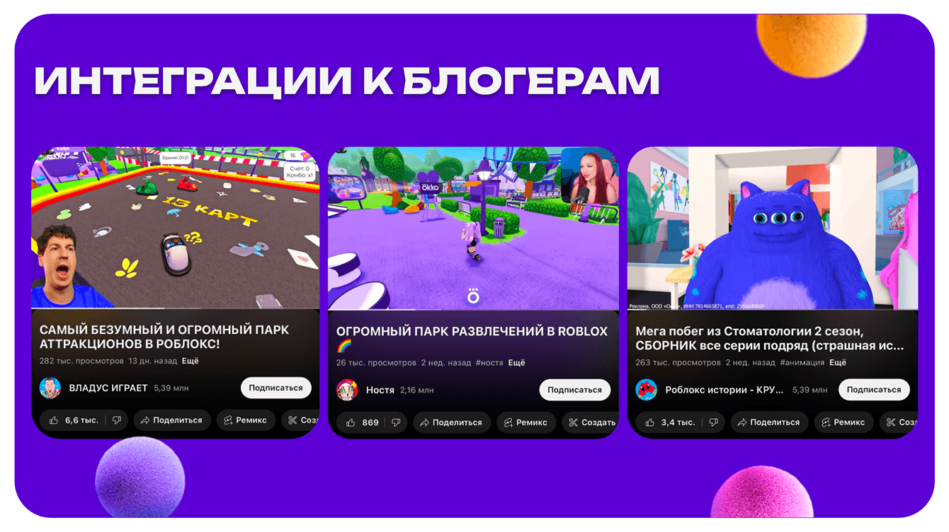 — Интеграциях в охватный контент амбассадоров детского профиля (Влад Глент, Денис Кукояка)