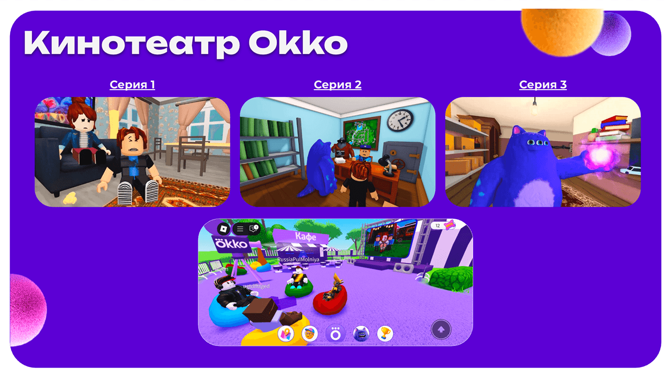 В мире Okko World были полноценно функционирующие летние кинотеатры. Специально для нашей вселенной мы выпустили эксклюзивный мини-мультсериал в Roblox-рисовке. Реализовали мы его совместно с самым популярным по количеству подписчиков креатором Roblox-фильмов в России – блогером «Крутой Папа».