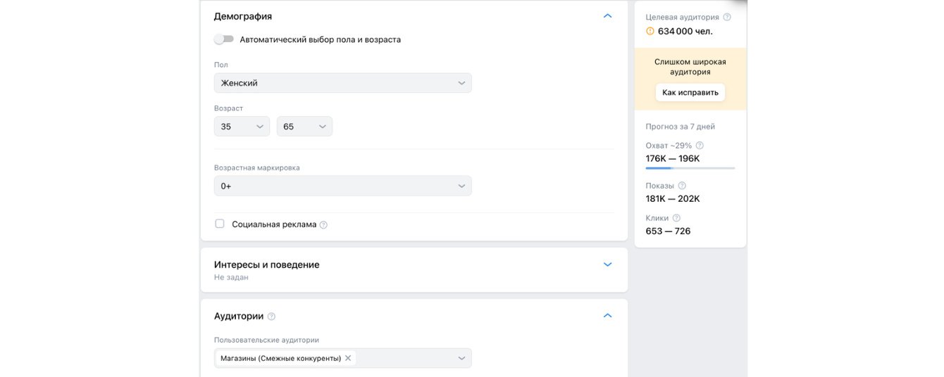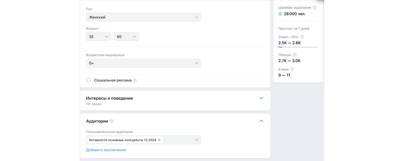 Помимо таргетирования на узкие аудитории проводили дополнительные тесты на более широкие аудитории, но ключевые результаты в среднем выходили дороже на 50-70%. Пример настроек такой аудитории: