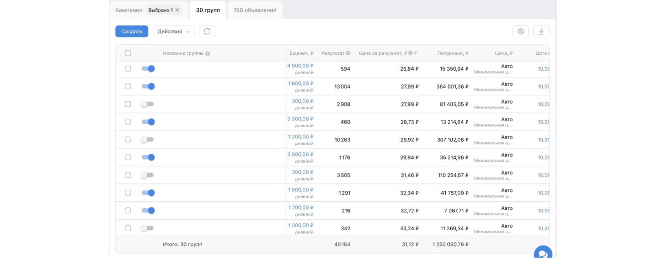 Также по кабинету видно, что в тестировании участвовало большое количество аудиторий — свыше 200. Они включали в себя комбинацию из широких и узких сегментов, основные из которых приведены в кейсе. Объемный тест аудиторий необходим для поиска наиболее заинтересованного "теплого" сегмента, поэтому мы не ограничиваемся несколькими группами.