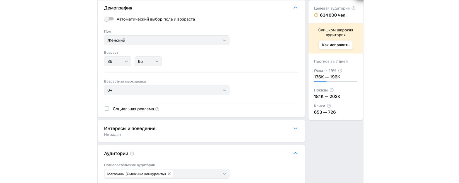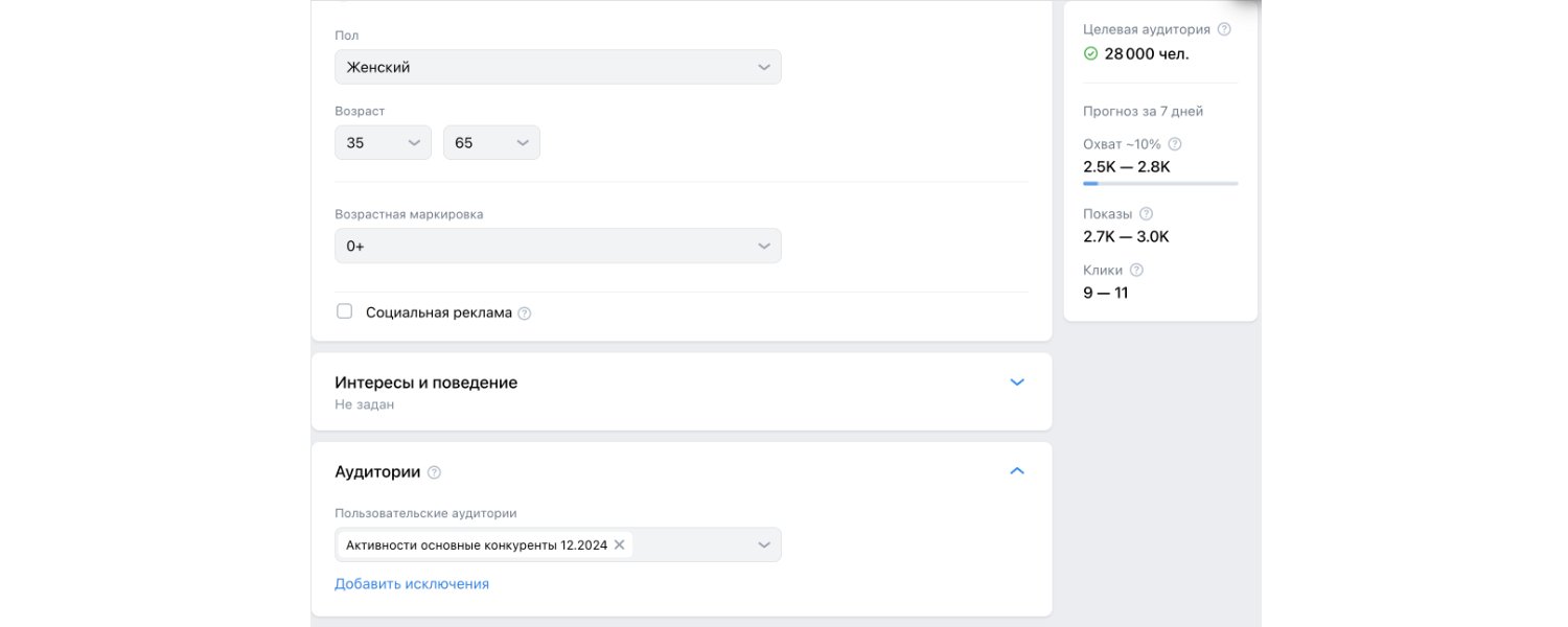 Помимо таргетирования на узкие аудитории проводили дополнительные тесты на более широкие аудитории, но ключевые результаты в среднем выходили дороже на 50-70%. Пример настроек такой аудитории: