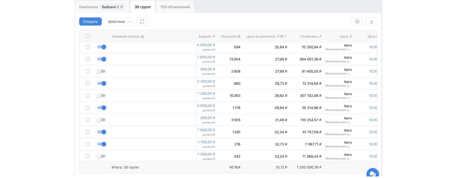 Также по кабинету видно, что в тестировании участвовало большое количество аудиторий — свыше 200. Они включали в себя комбинацию из широких и узких сегментов, основные из которых приведены в кейсе. Объемный тест аудиторий необходим для поиска наиболее заинтересованного "теплого" сегмента, поэтому мы не ограничиваемся несколькими группами.