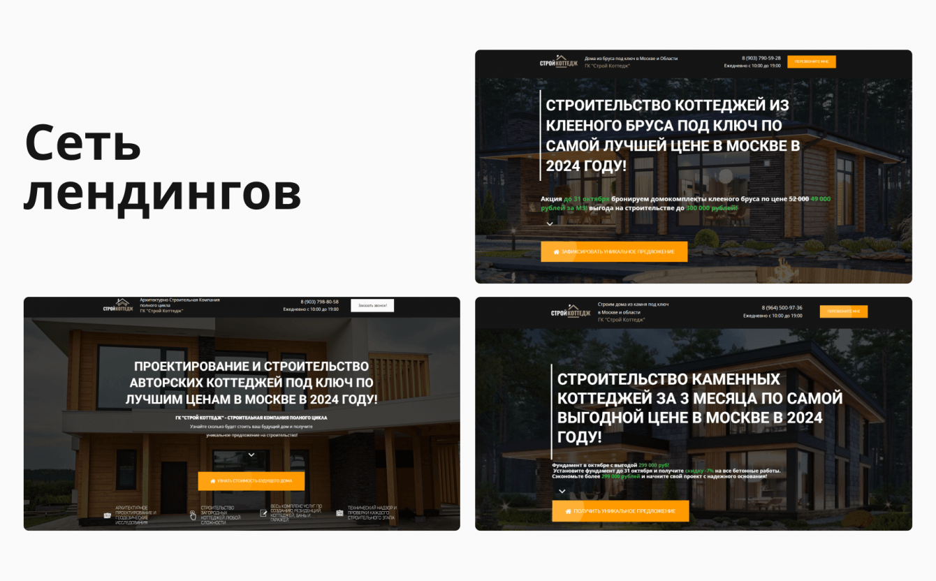 1. Разработку нескольких посадочных страниц для разных типов домов (из камня, клееного бруса, сип-дома и премиум-класса).