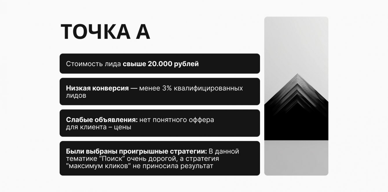 2. Оптимизацию кампаний — мы отказались от стратегии «максимум кликов», которая приводила к дорогим лидам, и сфокусировались на конверсии.