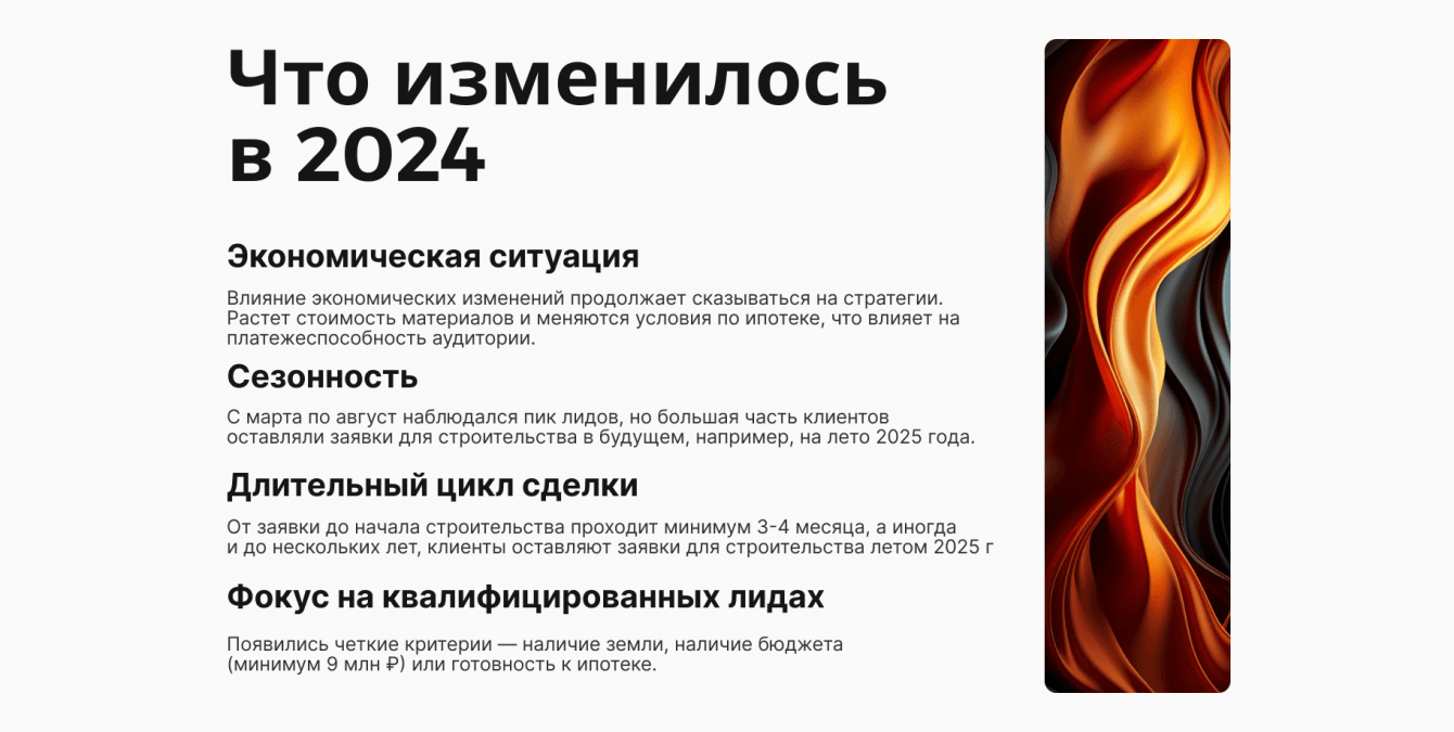 2. Акцент на привлечение качественных лидов для заполнения воронки, даже если клиенты планируют строить дома через несколько лет.