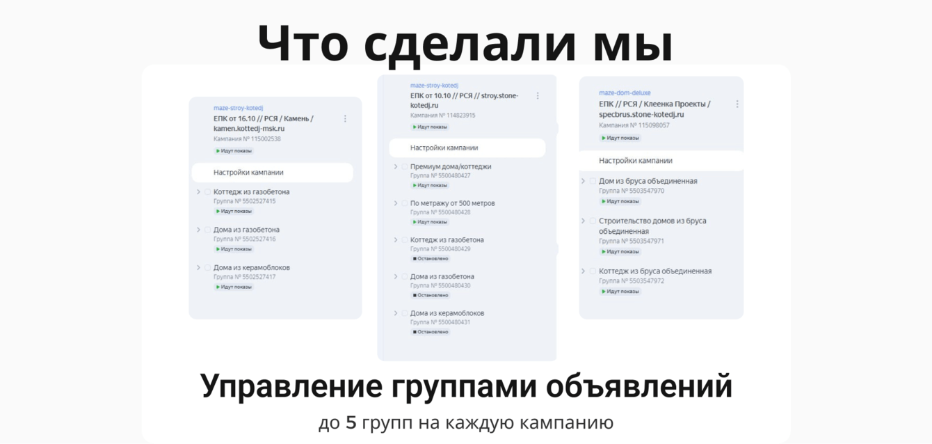 Мы ограничили количество групп до 5 на каждую кампанию, чтобы автостратегии могли качественно обучаться. Это позволило избежать распыления бюджета и обеспечить тестирование всех ключевых групп.