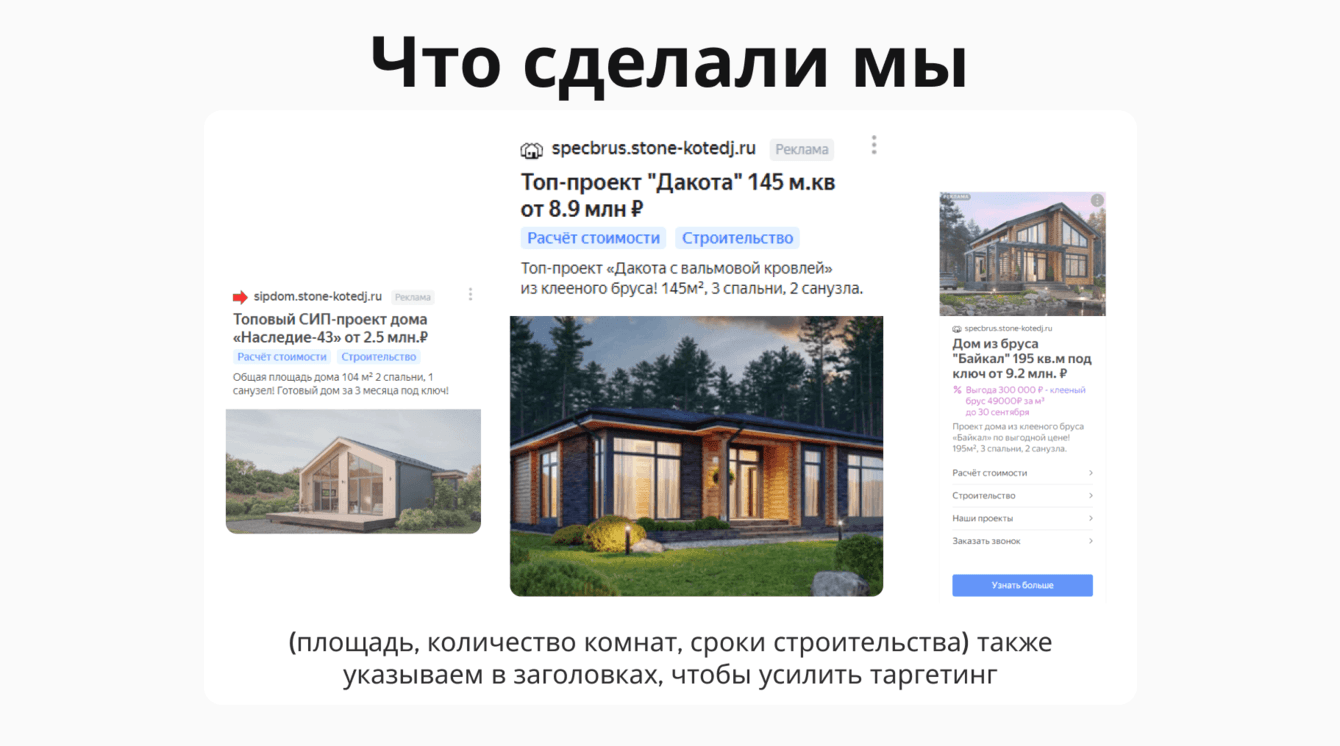3. Продвижение через лендинги: Использование сегментации для различных типов домов (из камня, клееного бруса, сип-дома и премиум-объекты) помогло избежать внутренней конкуренции и оптимизировать трафик.