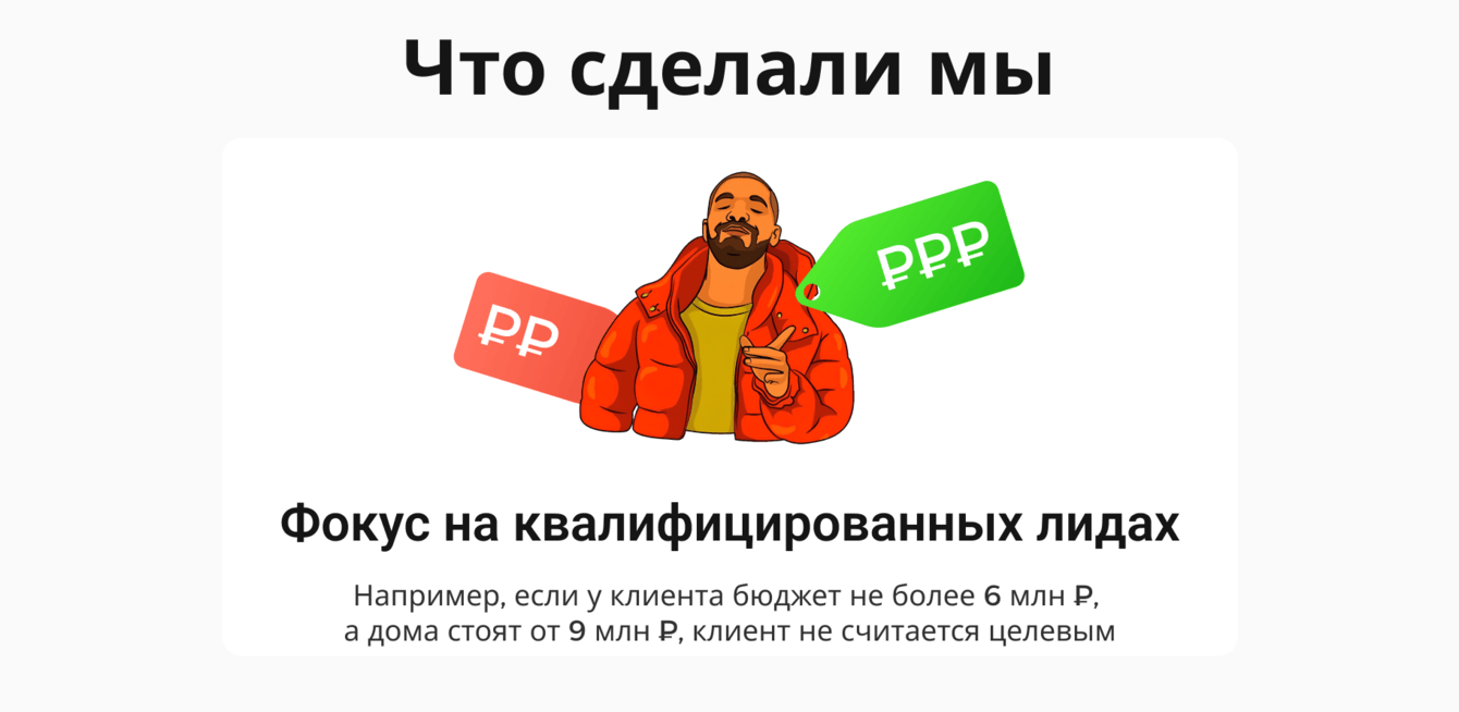 Важнейшая задача — привлечение лидов с определенными критериями: наличие земли, бюджет от 9 млн ₽ или готовность взять ипотеку, а также четкие сроки строительства. Клиентский отдел продаж работает только с квалифицированными лидами, что требует строгой фильтрации на этапе сбора трафика.