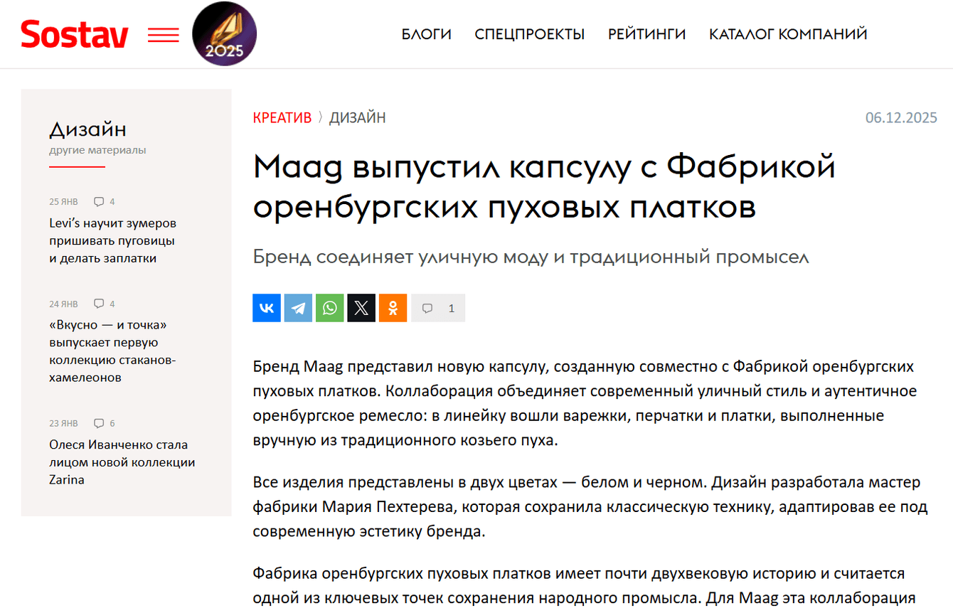 1. https://www.sostav.ru/publication/maag-vypustil-kapsulu-s-fabrikoj-orenburgskikh-pukhovykh-platkov-80192.html