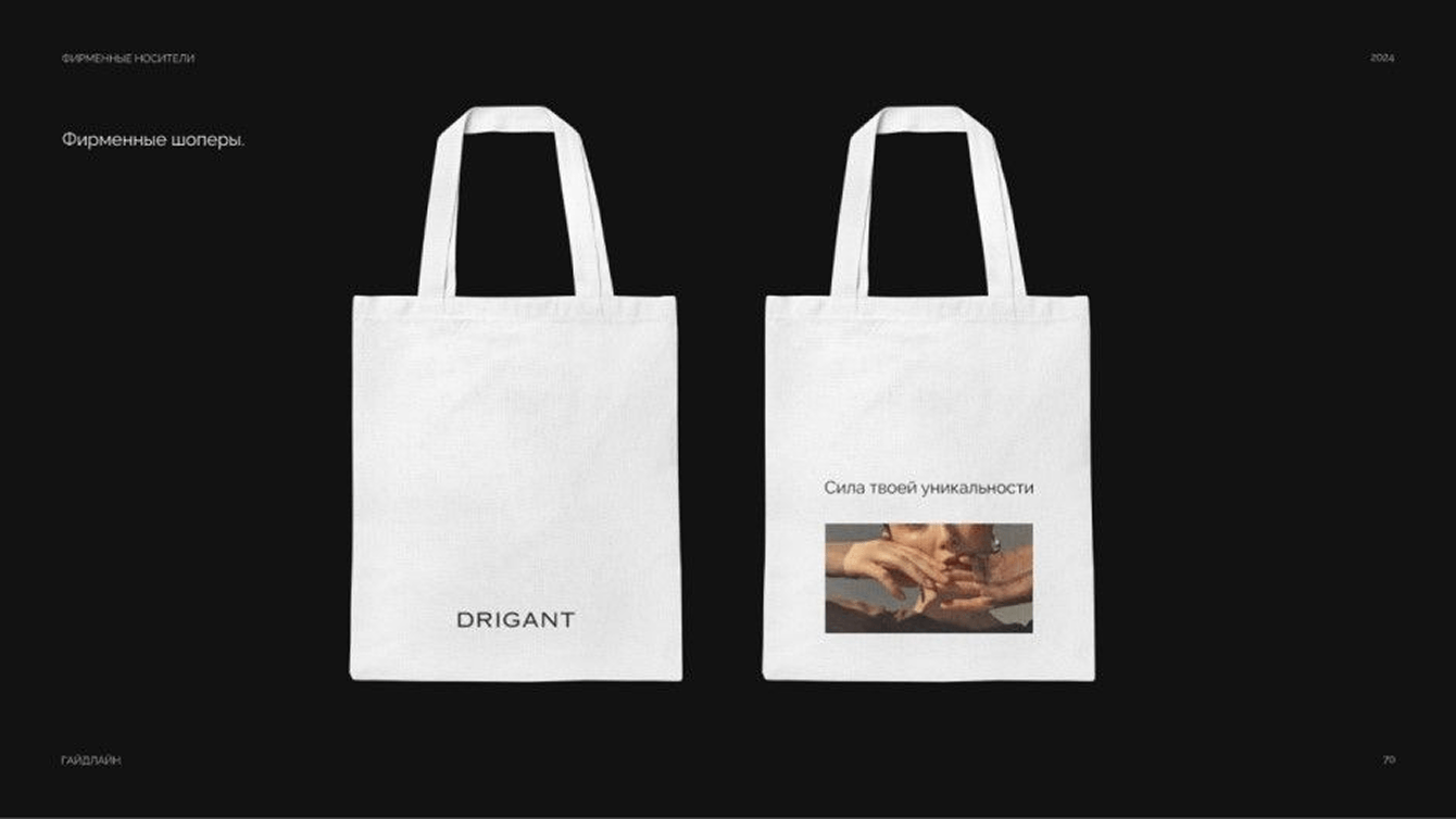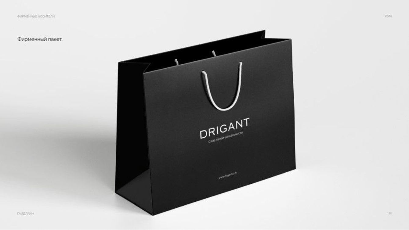 Когда клиент покупает продукцию, упакованную в фирменный пакет или шоппер, он ощущает сопричастность к общей идеи, к комьюнити единомышленников. А бренд получает дополнительную рекламу. Поэтому мы разработали дизайн плотных пакетов и шопперов для DRIGANT:
