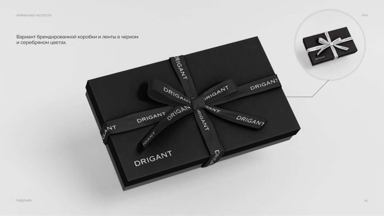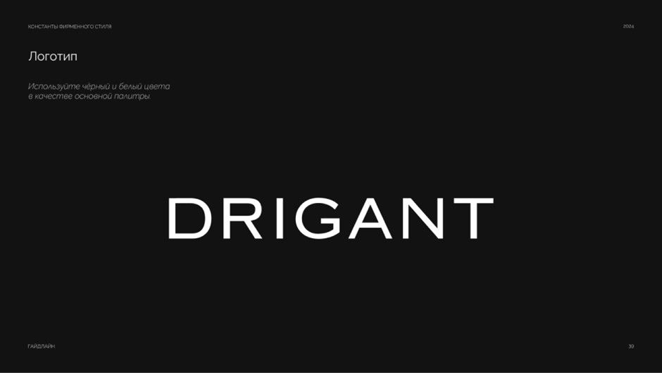 Цветовая гамма бренда или фиксированный набор цветов также влияют на восприятие компании. Для DRIGANT мы определили чёрный и белые цвета как основные, а бежевый цвет — для фона в презентациях и соцсетях. Это классические цвета, они подчеркивают силу, самодостаточность и минимализм.