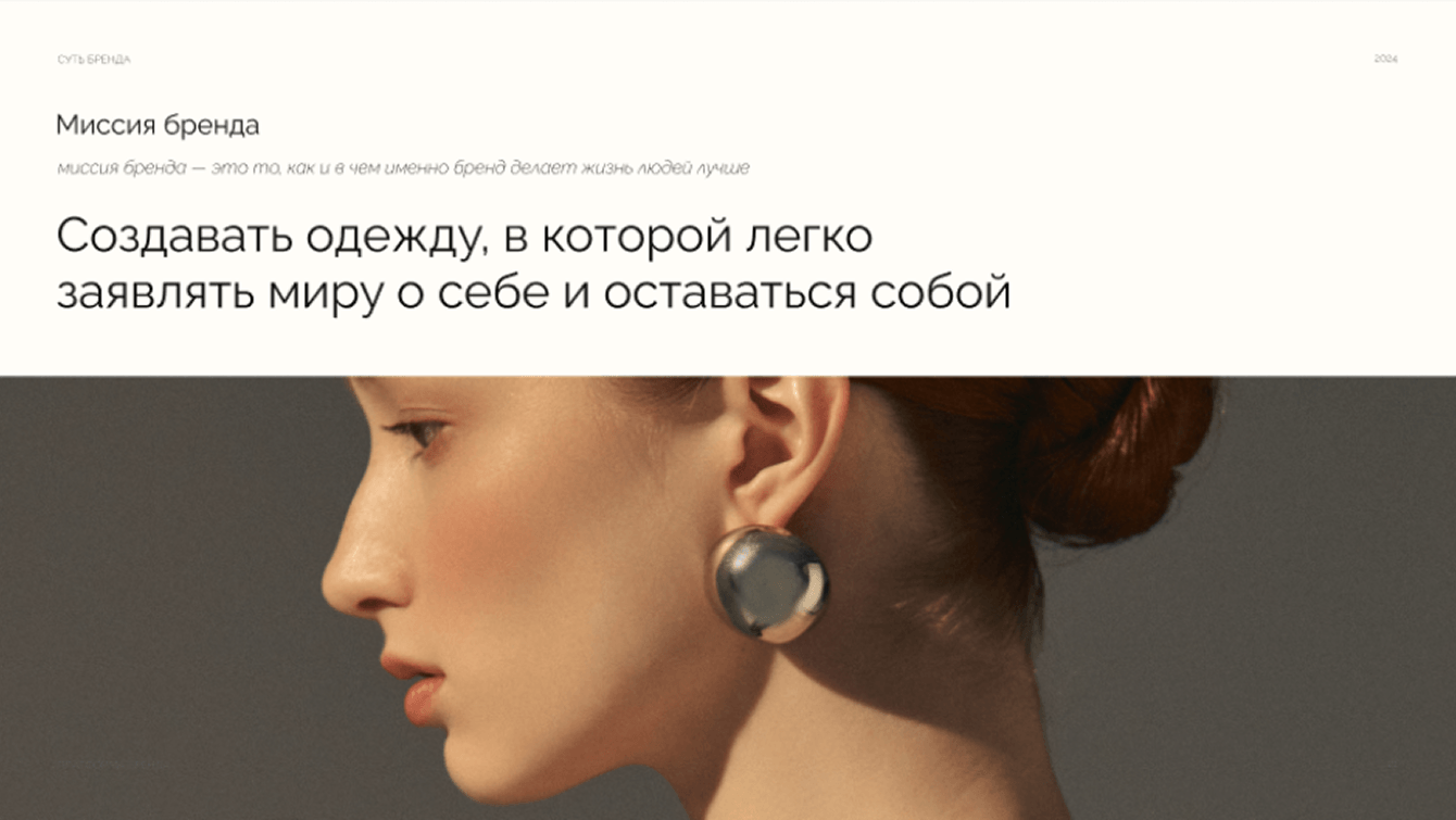 Так мы добрались до сути бренда: «Отражать внутреннюю красоту через одежду». Эта мысль фиксирует главную идею компании.