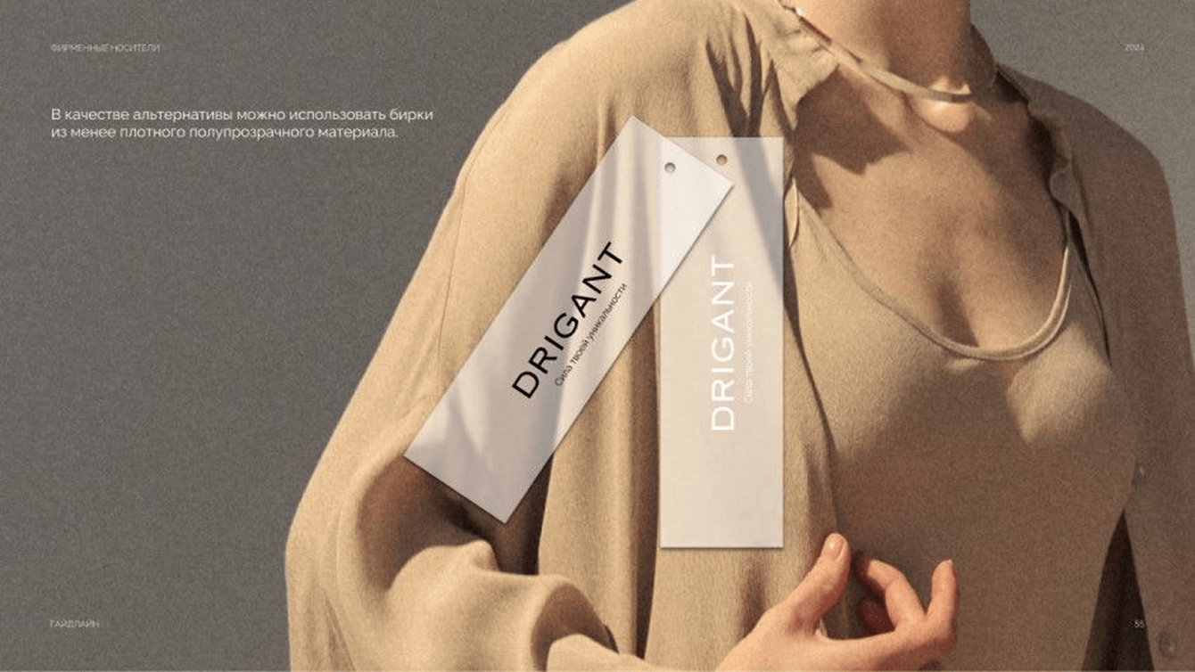 Также мы разработали бирки и лейблы для одежды. Пожелание клиента — сделать вариант бирок также для тонких, летящих тканей. Это важно учитывать, поскольку плотные бирки будут смотреться массивно на такой одежде. Мы подготовили два варианта: