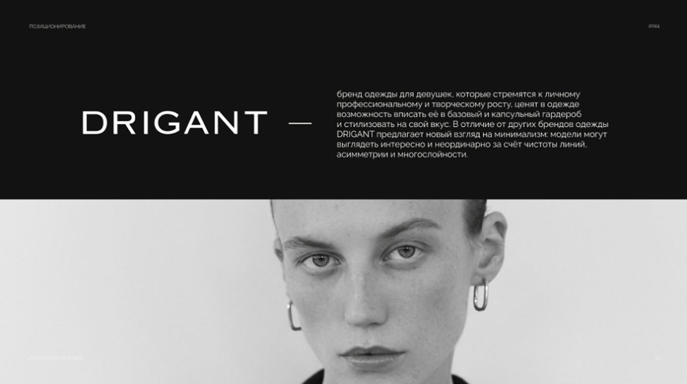 Для fashion-бренда DRIGANT мы разработали бренд-платформу и фирменный стиль, чтобы привлечь внимание широкой и более молодой аудитории. Новое позиционирование и инструменты брендинга можно применять в дальнейшей работе с клиентом в performance-маркетинге.