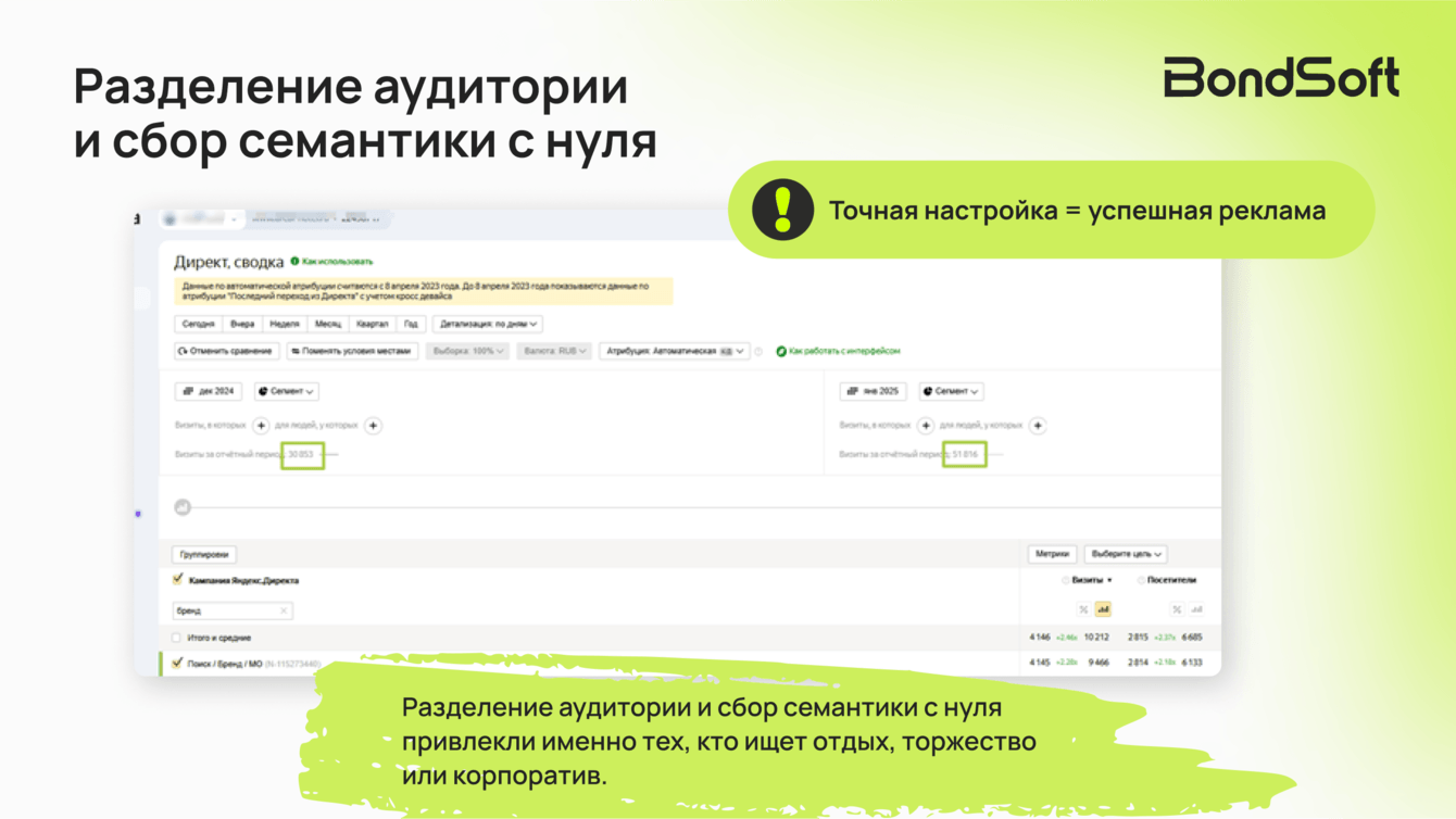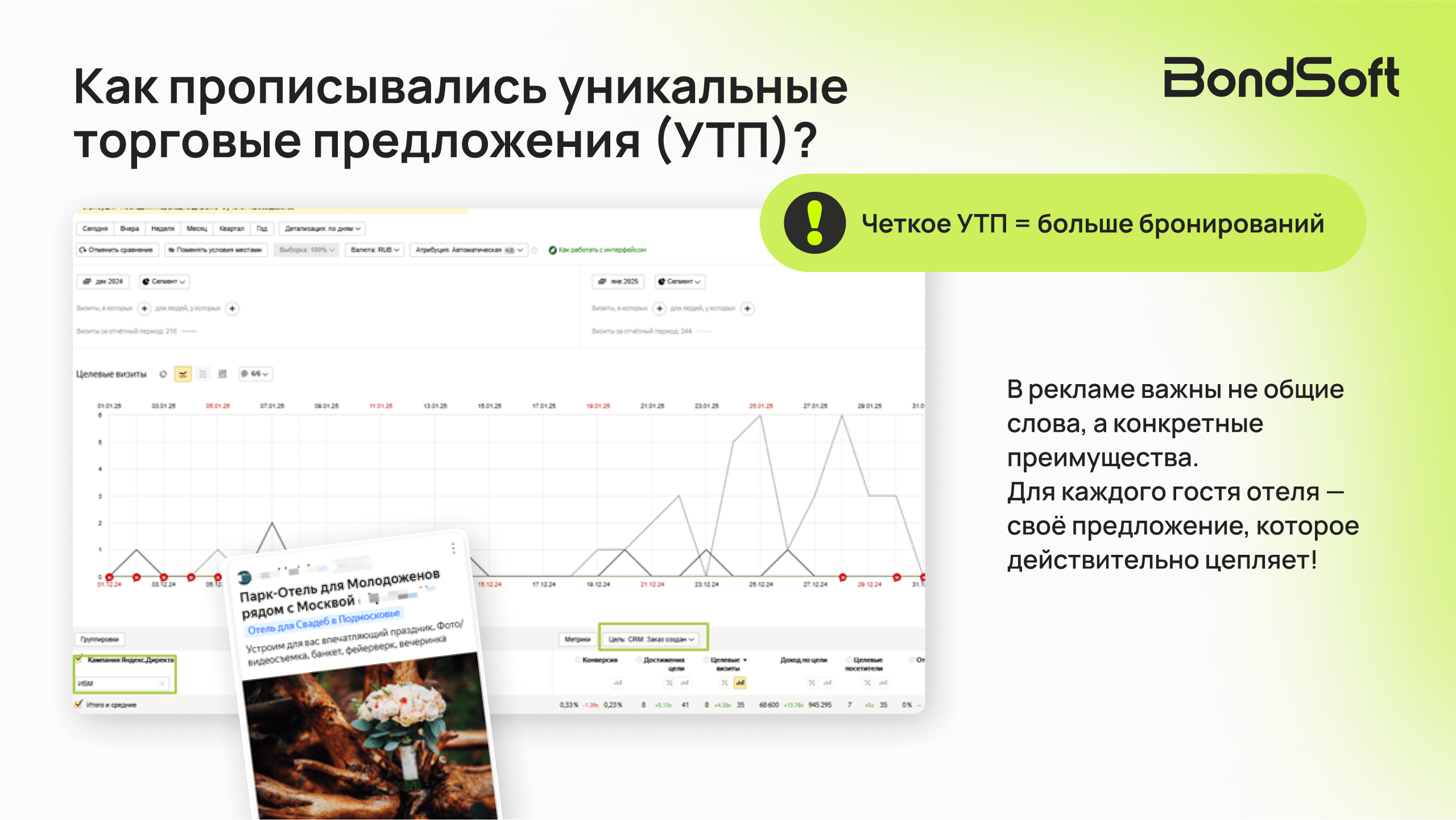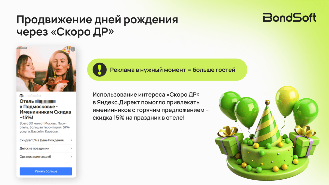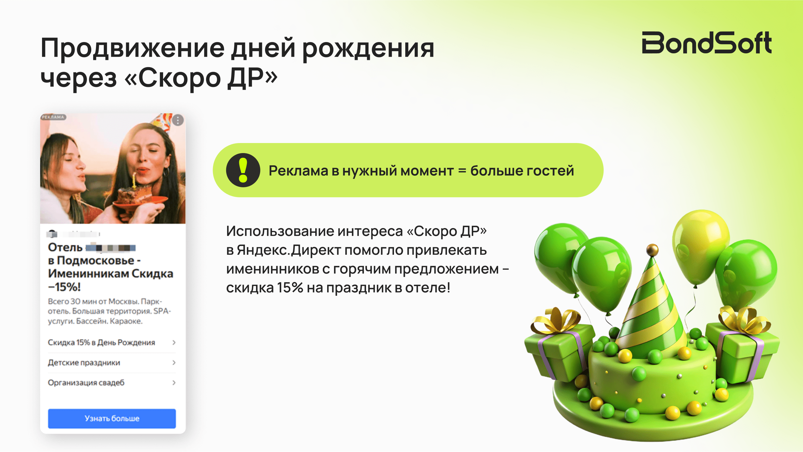 — Использование таргетинга «Скоро день рождения» в Яндексе дало всплеск бронирований от именинников. Аудитория реагирует на персональные предложения.