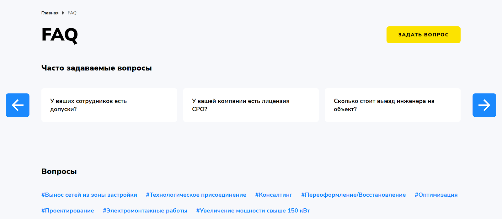 Раздел с ответами на частые вопросы, где мы не только отрабатываем вопросы и возражения клиентов, но и получаем возможность охватить релевантным контентом огромное количество информационных запросов: