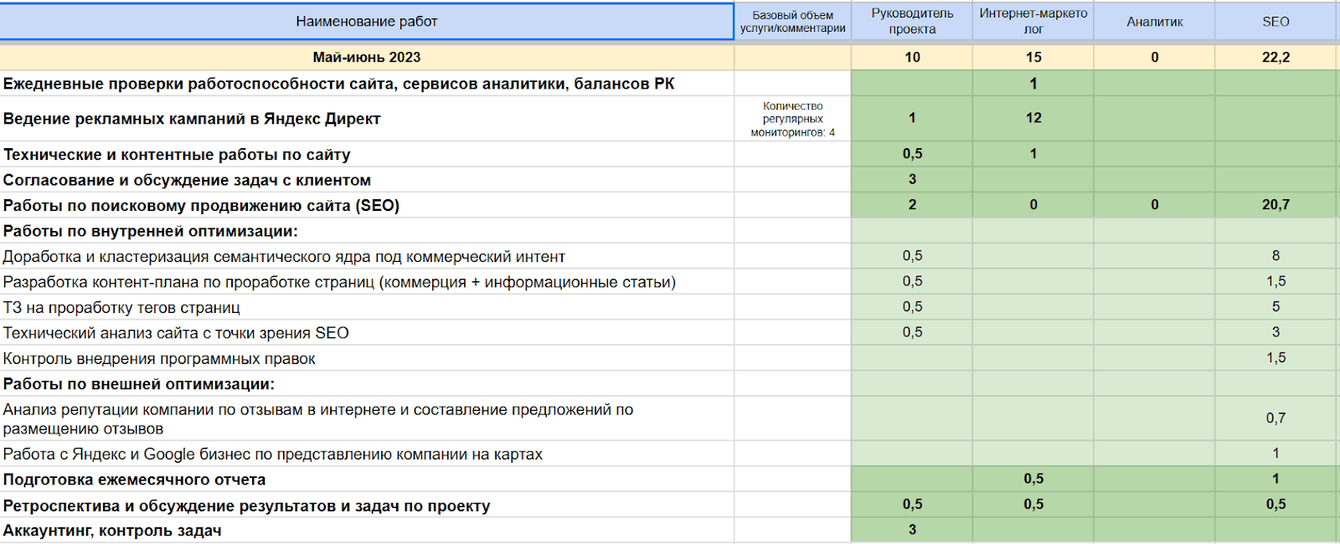 По каждому направлению работ мы составили детальные сметы с расчетом трудозатрат вплоть до получаса.
