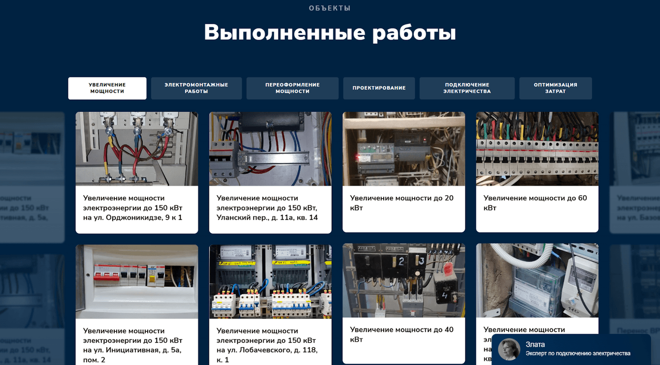 Реализованные объекты вынесли в отдельный раздел с детальными описаниями: что за предприятие, какая стояла задача, что сделали, что получилось. Это самое важное, что может увидеть потенциальный клиент. Не то, что вы умеете в теории, а то, что вы уже сделали на практике.