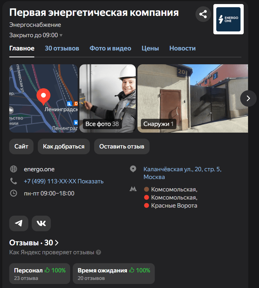Дополнительно проработали карточку компании в Яндекс Бизнесе, чтобы создать еще одну точку контакта с потенциальными клиентами и получить дополнительную платформу для публикации фотографий, новостей и отзывов о работе компании.
