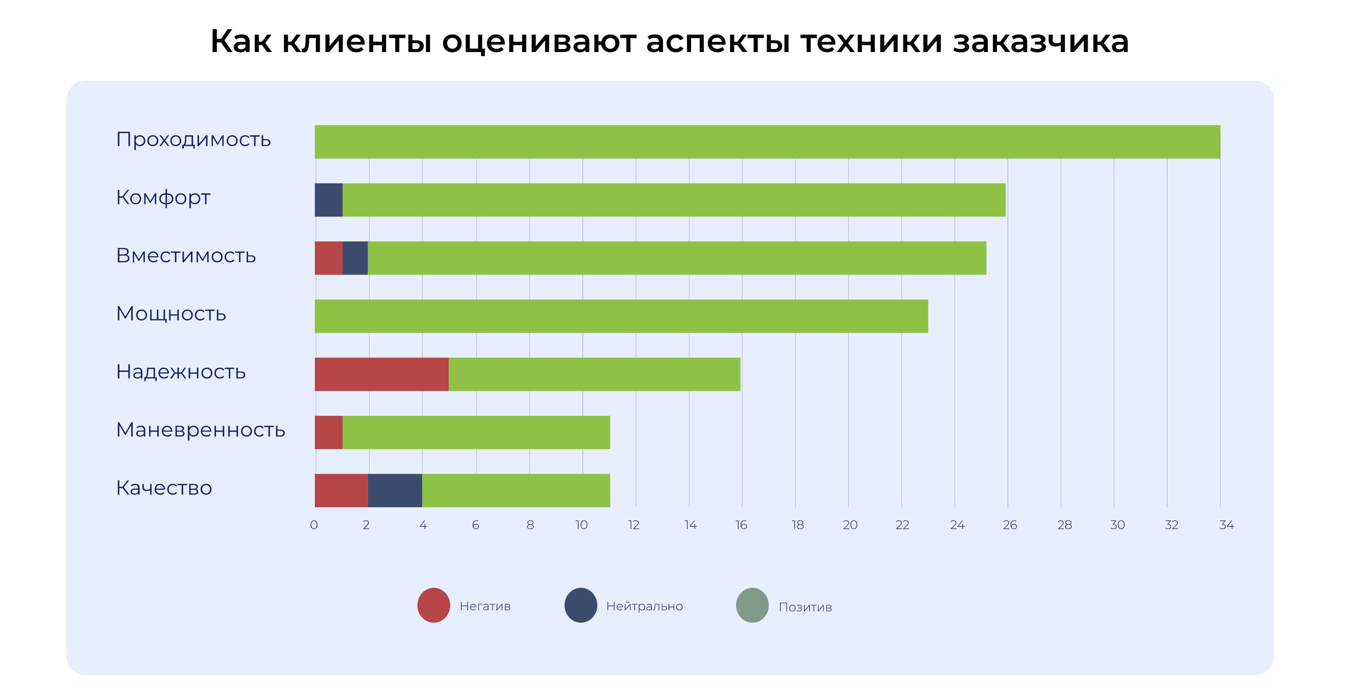 Более подробный анализ выявил позитивную оценку разных характеристик техники. Чтобы углубить анализ, разработали систему аспектов (так как подходящей категории нет в автоматическом режиме), тональность проставлялась вручную.