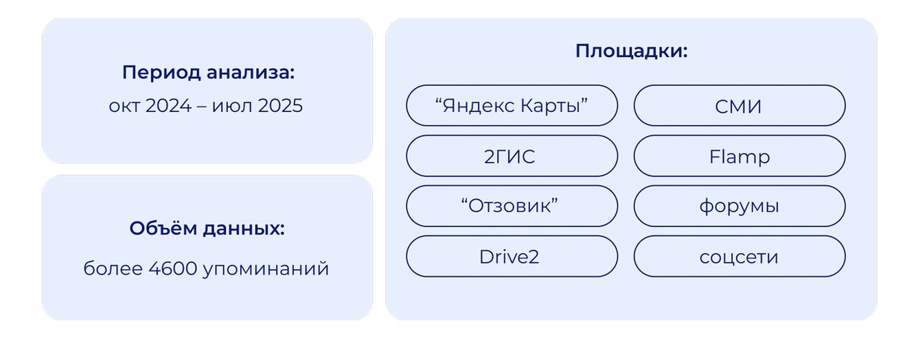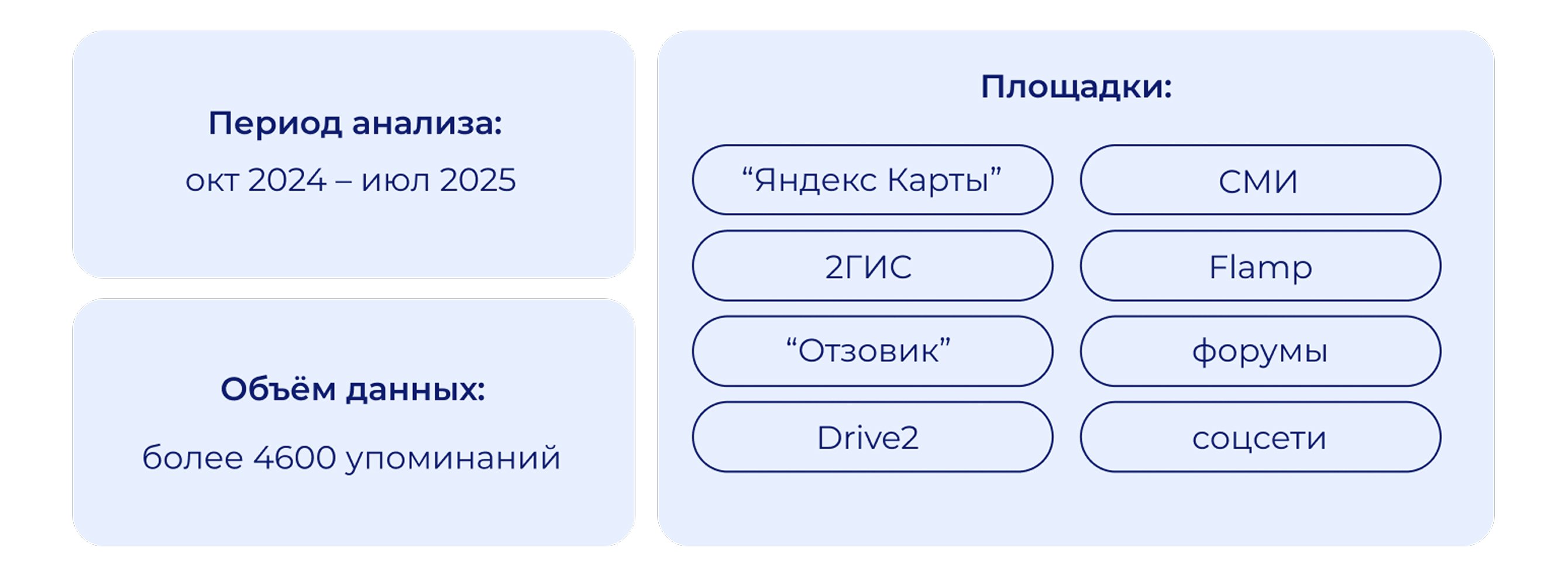 За период с октября 2024 по июль 2025 года было собрано более 4600 упоминаний. Анализ охватывал «Яндекс Карты», 2ГИС, «Отзовик», профильные форумы, соцсети и СМИ.