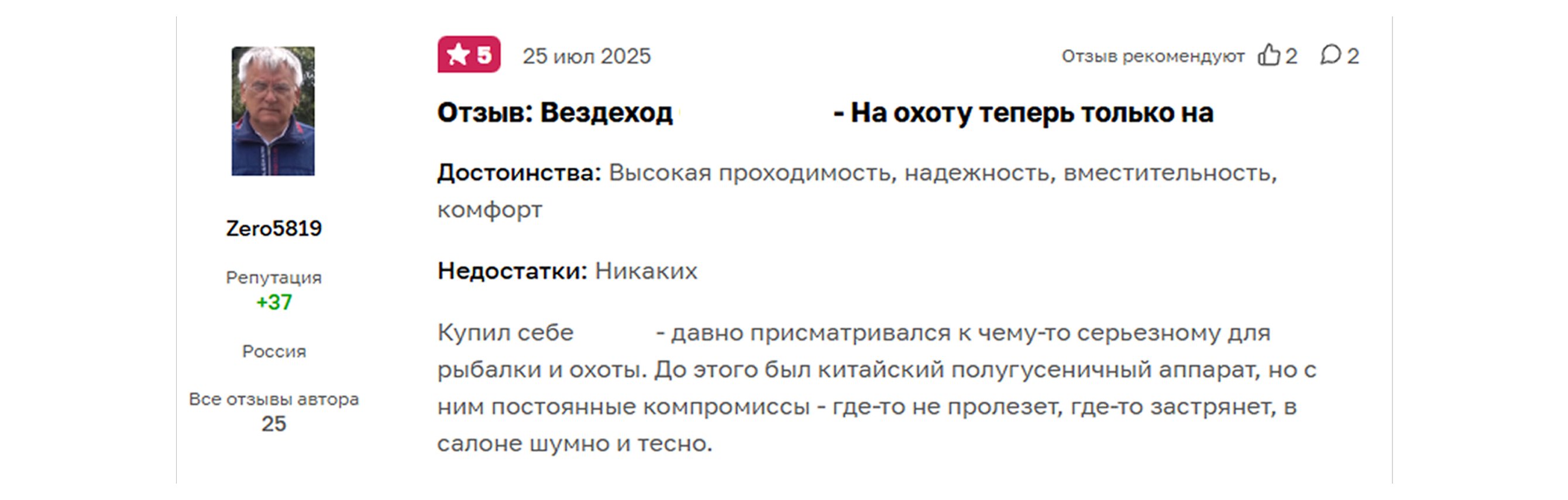Собрано 200+ отзывов от реальных владельцев и экспертов. Поддержаны позитивные публикации лайками и комментариями. Активизированы обсуждения на профильных форумах. Запущено SEO по запросам: «надёжные вездеходы Россия», «амфибии для охоты», «техника для Крайнего Севера».