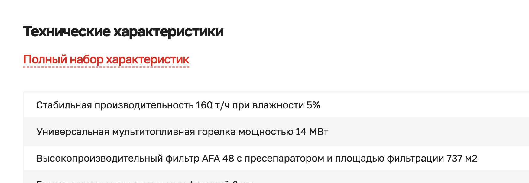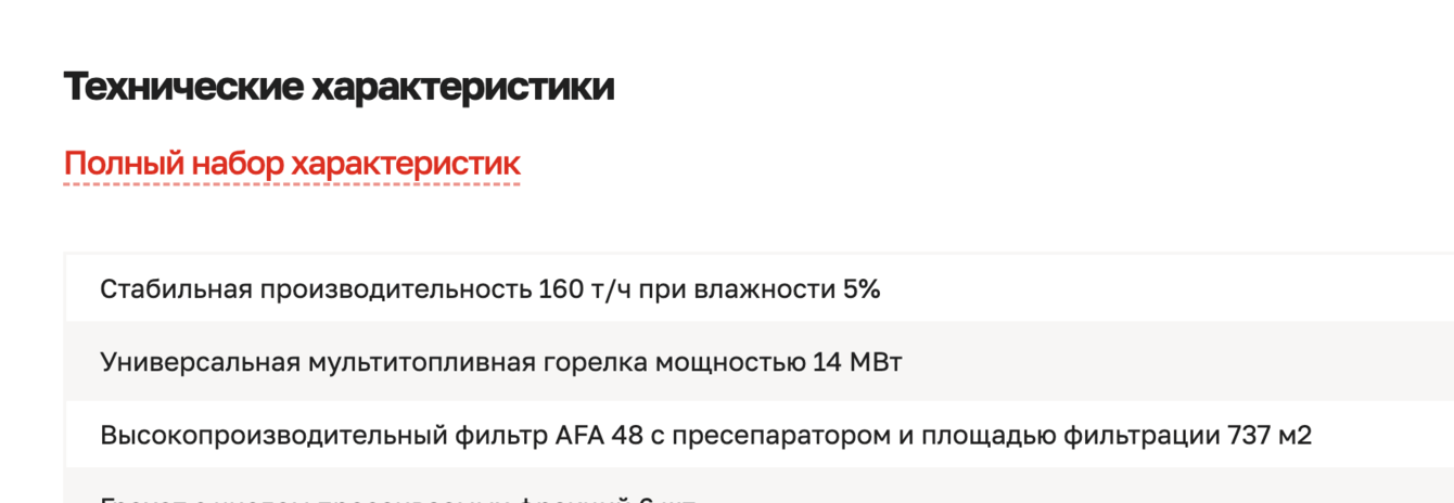 Обязательным условием клиента было добавление полного набора технических характеристик, который показывается при клике на кнопку.