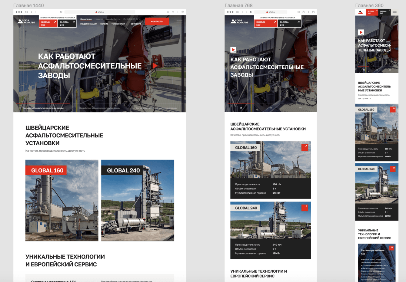 Чтобы в легкой и доступной форме представить сложные технологические процессы, асфальтосмесительные заводы и технологии компании, сделали основной акцент на визуализации заводов. Добавили на сайт фото и видео с производства, снабдили их кратким описанием и наглядными красочными схемами.