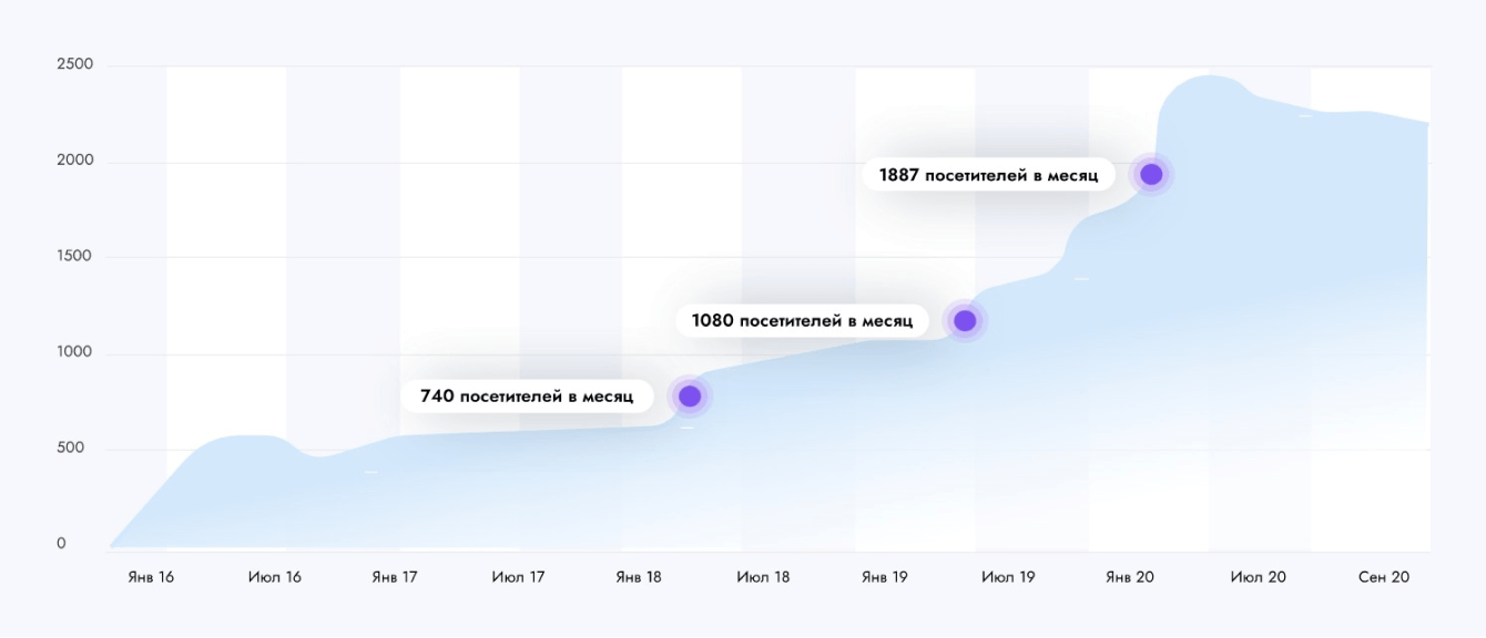 Через 16 месяцев работы увеличили посещаемость сайта с 314 до 1 916 посетителей, что при средней конверсии сайта в 7,5% приводит от 120 до 140 обращений в месяц.