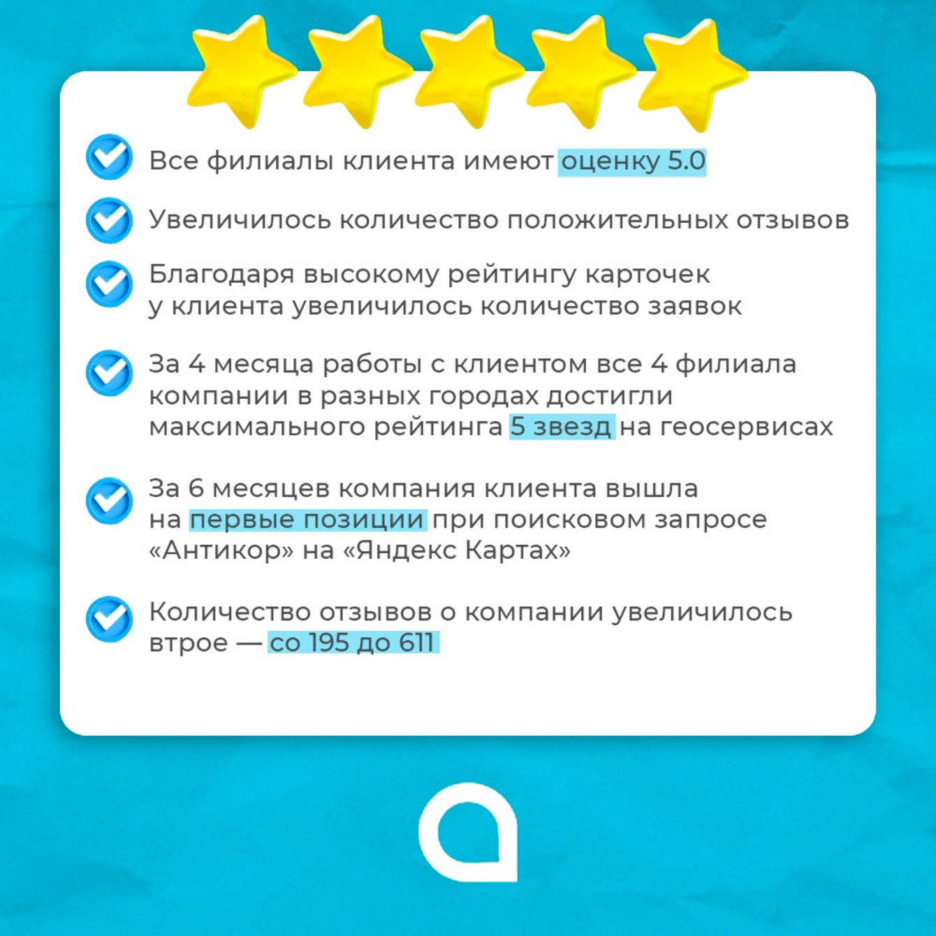 - За 4 месяца работы с клиентом все 4 филиала компании в разных городах достигли максимального рейтинга 5 звезд на геосервисах.