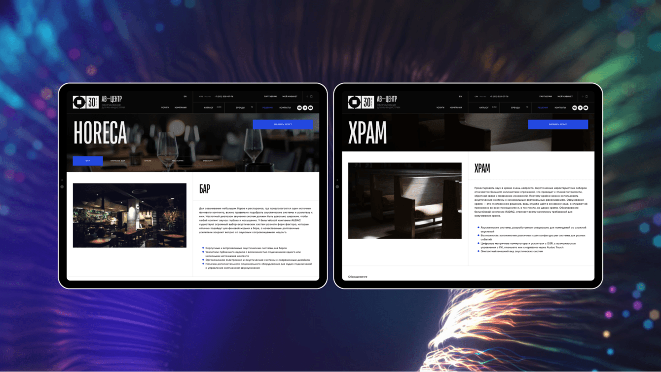 Каждая категория организована так, чтобы не перегружать пользователя информацией. Например, выбрав «Бар», клиент попадает на страницу с пояснением, какие особенности важны для звукового и мультимедийного оснащения таких пространств. Ниже — готовая подборка оборудования: акустические системы, усилители, кабели. Всё, что нужно для решения задачи.