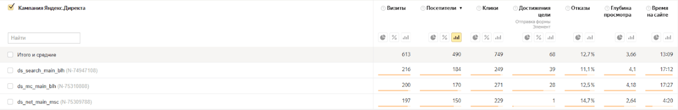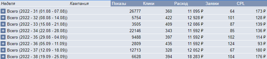 После двух недель работы стало понятно, что сетевая кампания расходует бюджет без заявок, да и поведенческие показатели — отказы, глубина просмотра и время на сайте — были не очень. Мы приняли решение от РСЯ отказаться и перераспределить этот бюджет в пользу других рекламных кампаний.