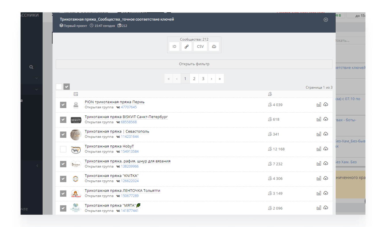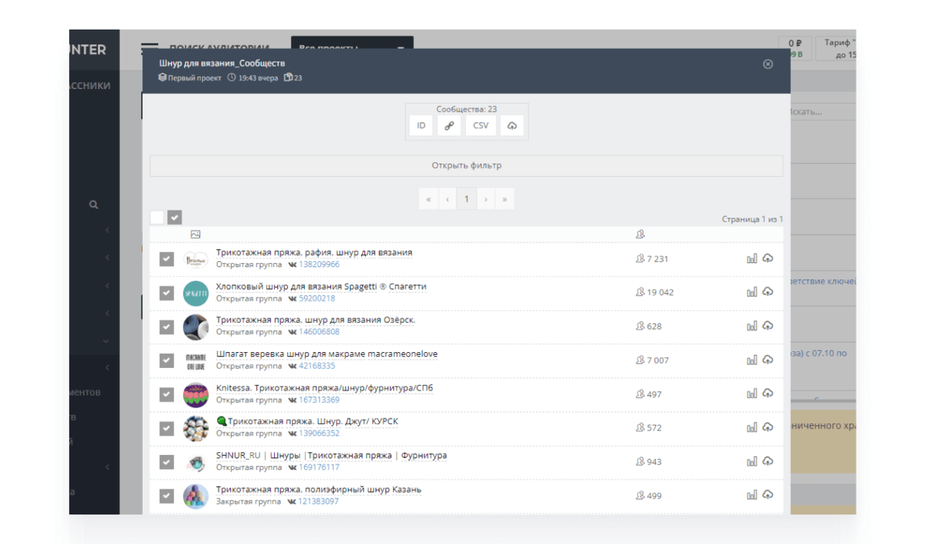 С помощью таргет хантера (TargetHunter - онлайн-сервис для поиска сведений о ЦА для бизнеса ВКонтакте) мы собрали тематические группы по приоритетным товарам: