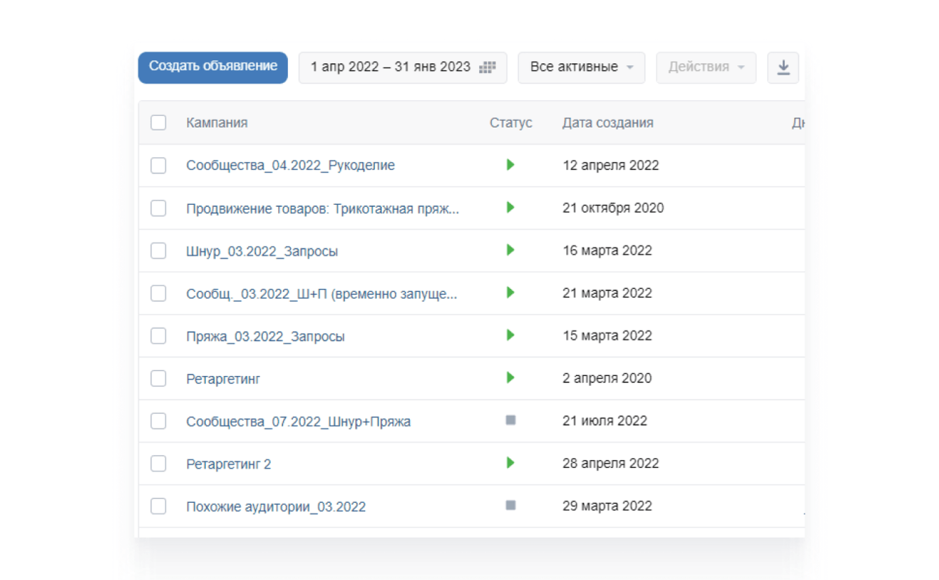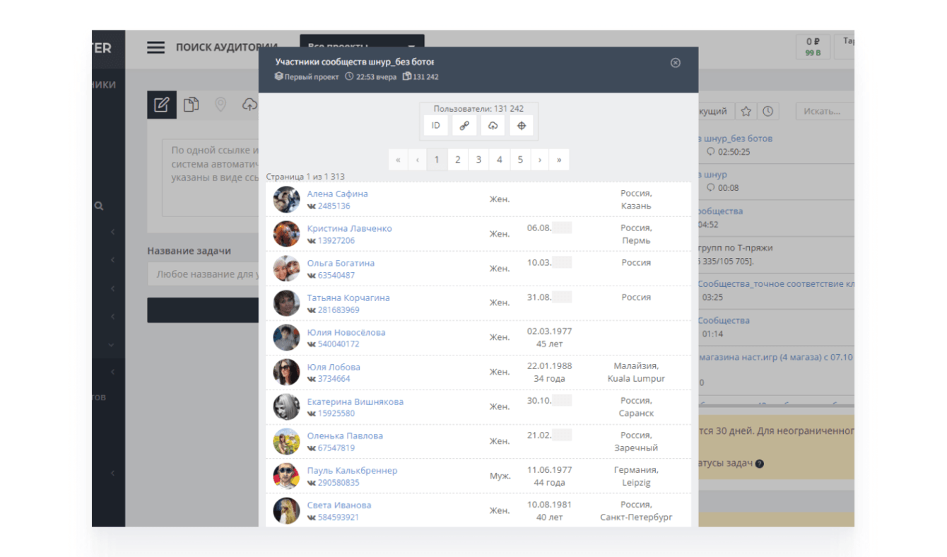 Далее из этих групп мы отобрали участников и отфильтровали ботов так, чтобы остались только живые люди. Потом создали объявления, как на собранные группы, так и на аудитории пользователей.