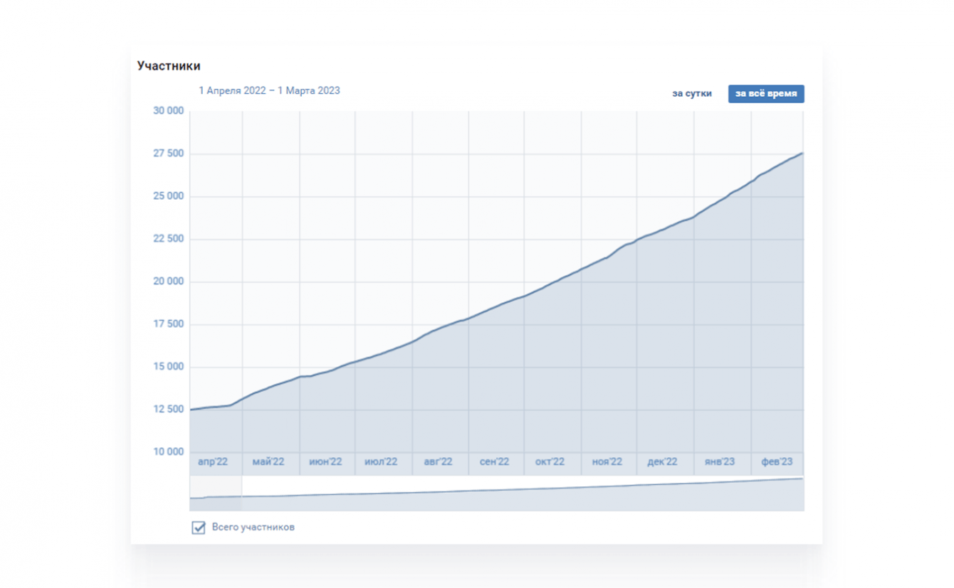 3. За 11 месяцев с апреля 2022 по февраль 2023 аудитория группы увеличилась на 15.066 человек, с 12.500 до 27.566.