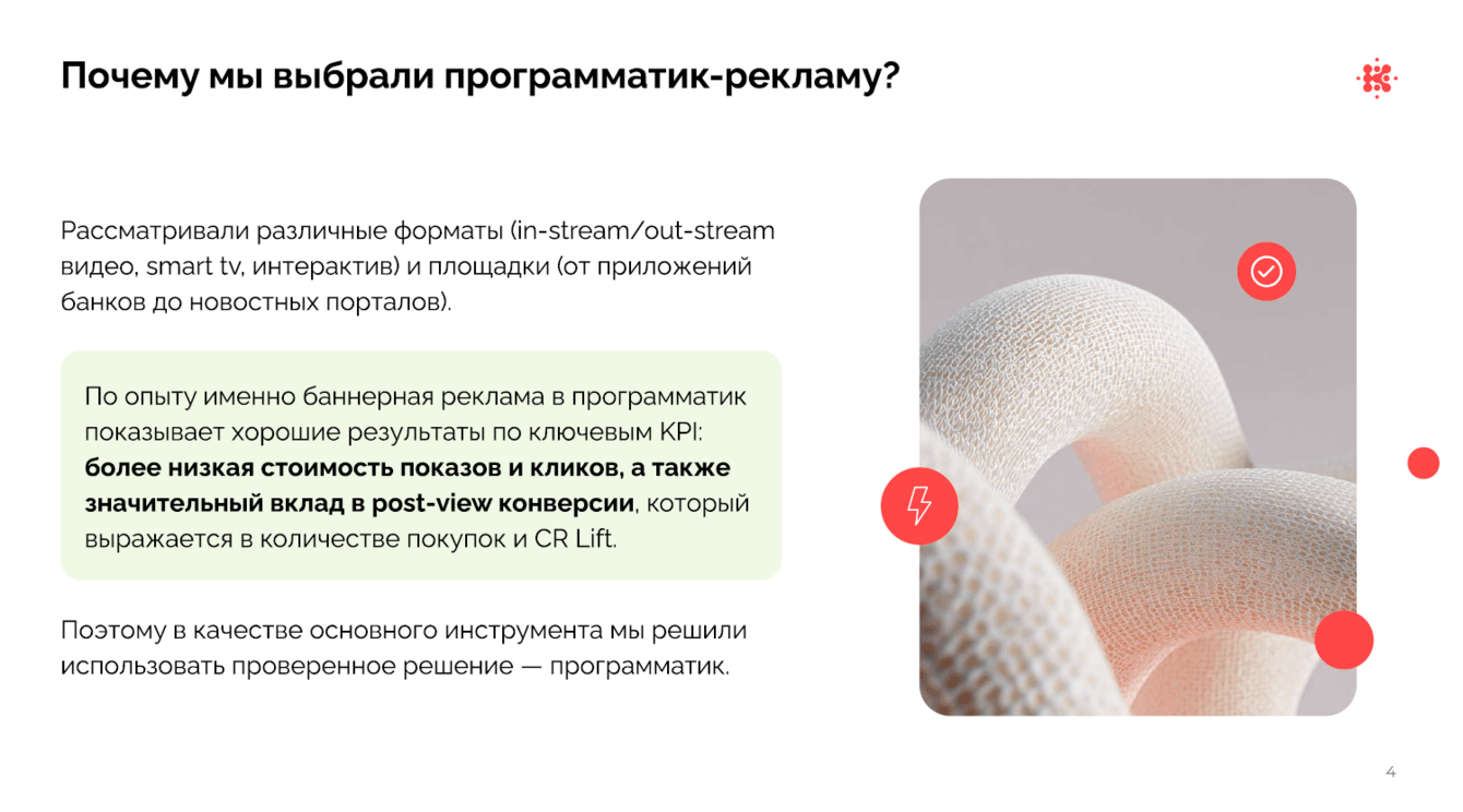 По опыту именно баннерная реклама в программатик показывает хорошие результаты по ключевым KPI: более низкая стоимость показов и кликов, а также